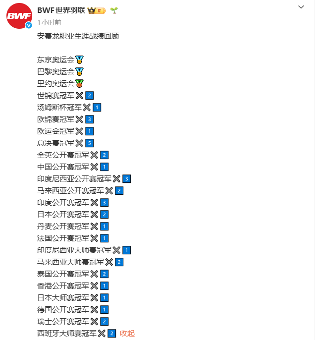 世界羽联官方发文向安赛龙致敬:“他留下的不只是冠军与纪录,更是一段属于男子单打的时代记忆。传奇,不说再见。谢谢你,安赛龙。”